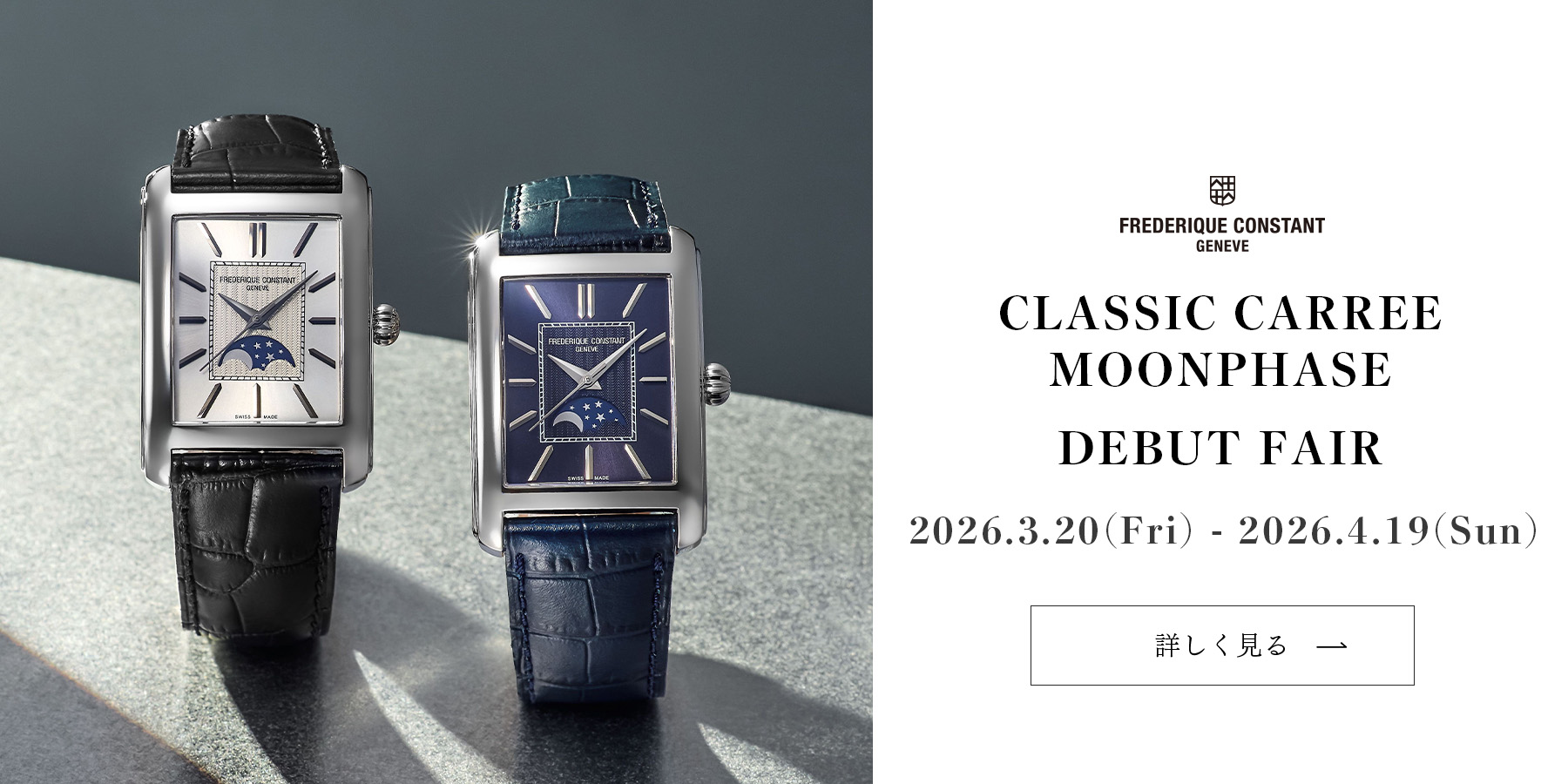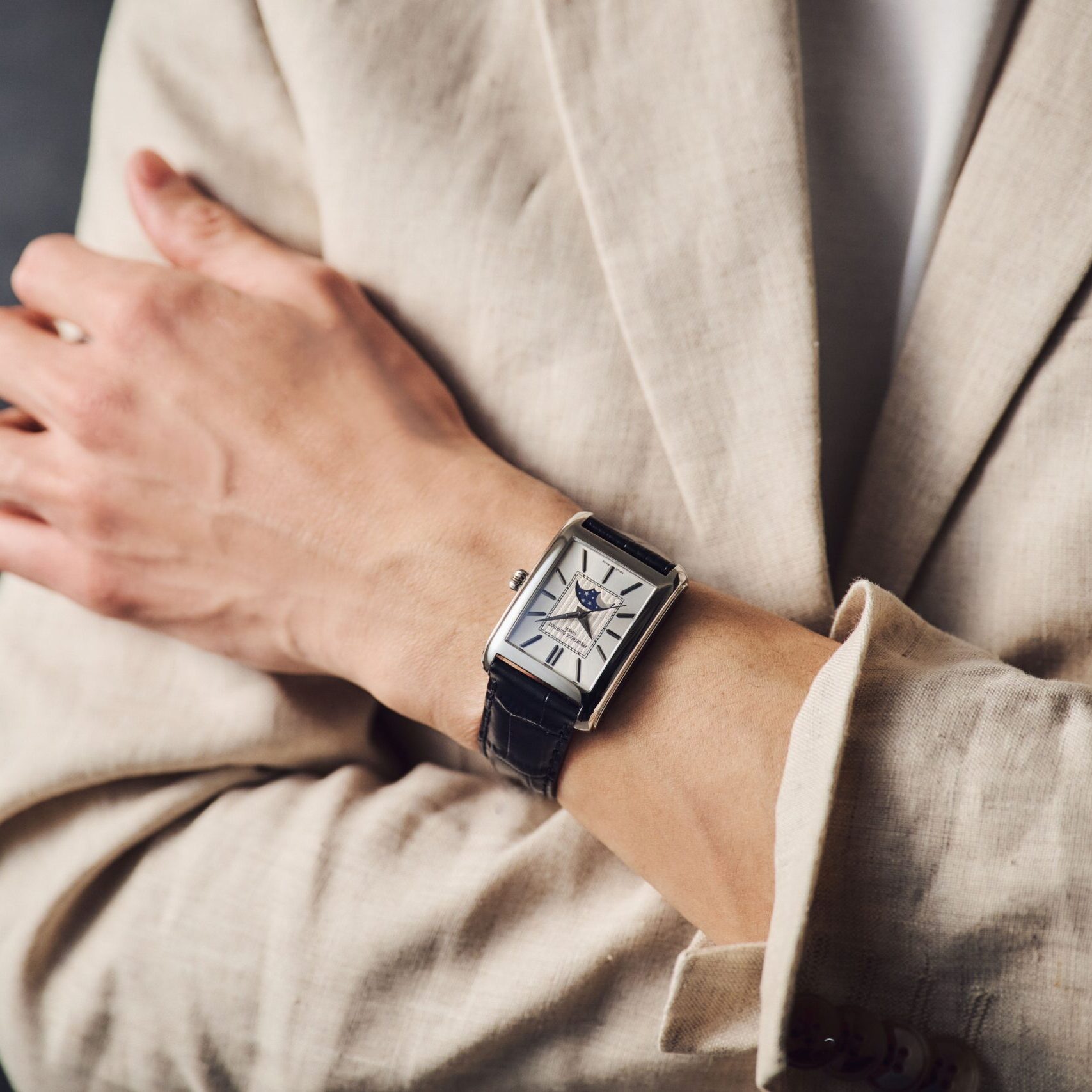 ブランドの象徴的な角型コレクション「クラシック カレ」に、ムーンフェイズを搭載したモデルです。