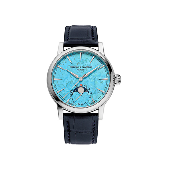 シックなエレガンスに貫かれた現代的なデザインに、伝統的なDNAを継承した「クラシック ムーンフェイズ デイト マニュファクチュール」。ジュネーブ製の伝統的なタイムピースを愛するすべての人々が日常的に愛用できるようデザインされたこのモデルに、ターコイズの文字盤を配した世界限定モデルがブティック東京先行モデルとして登場します。径40㎜の小ぶりなステンレスケースに、自社開発した<FC-716>キャリバーが搭載され、72時間パワーリザーブを誇ります。