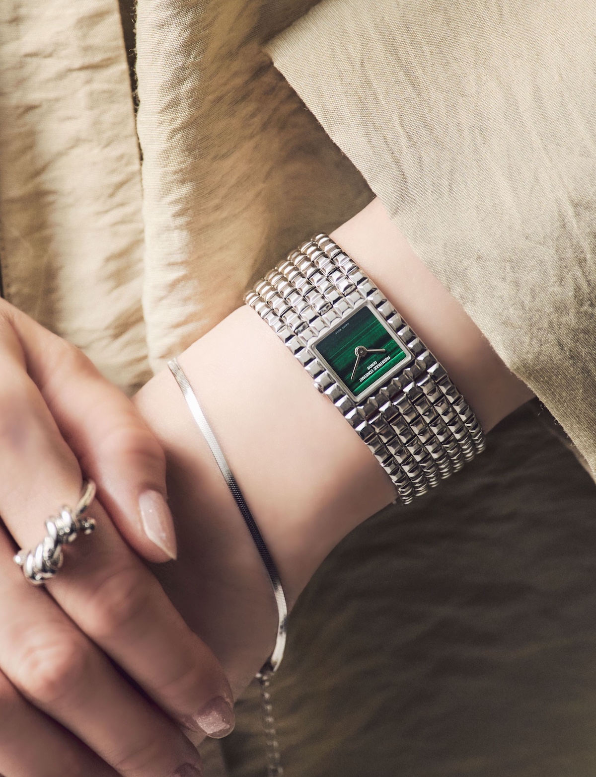 20年以上ぶりに復活を遂げた、カフウォッチのアイコン「マンシェット」。“時を読む”以上に“装うこと”を楽しむ、フレデリック・コンスタントが贈るジュエリーウォッチです。7リンク構成のブレスレットと一体化したスクエア文字盤が、手元をエレガントに引き立てます。天然石ならではの表情豊かなグリーンが印象的なマラカイトダイヤル。シンプルな時分針のみのデザインが、素材の美しさをより際立たせます。
