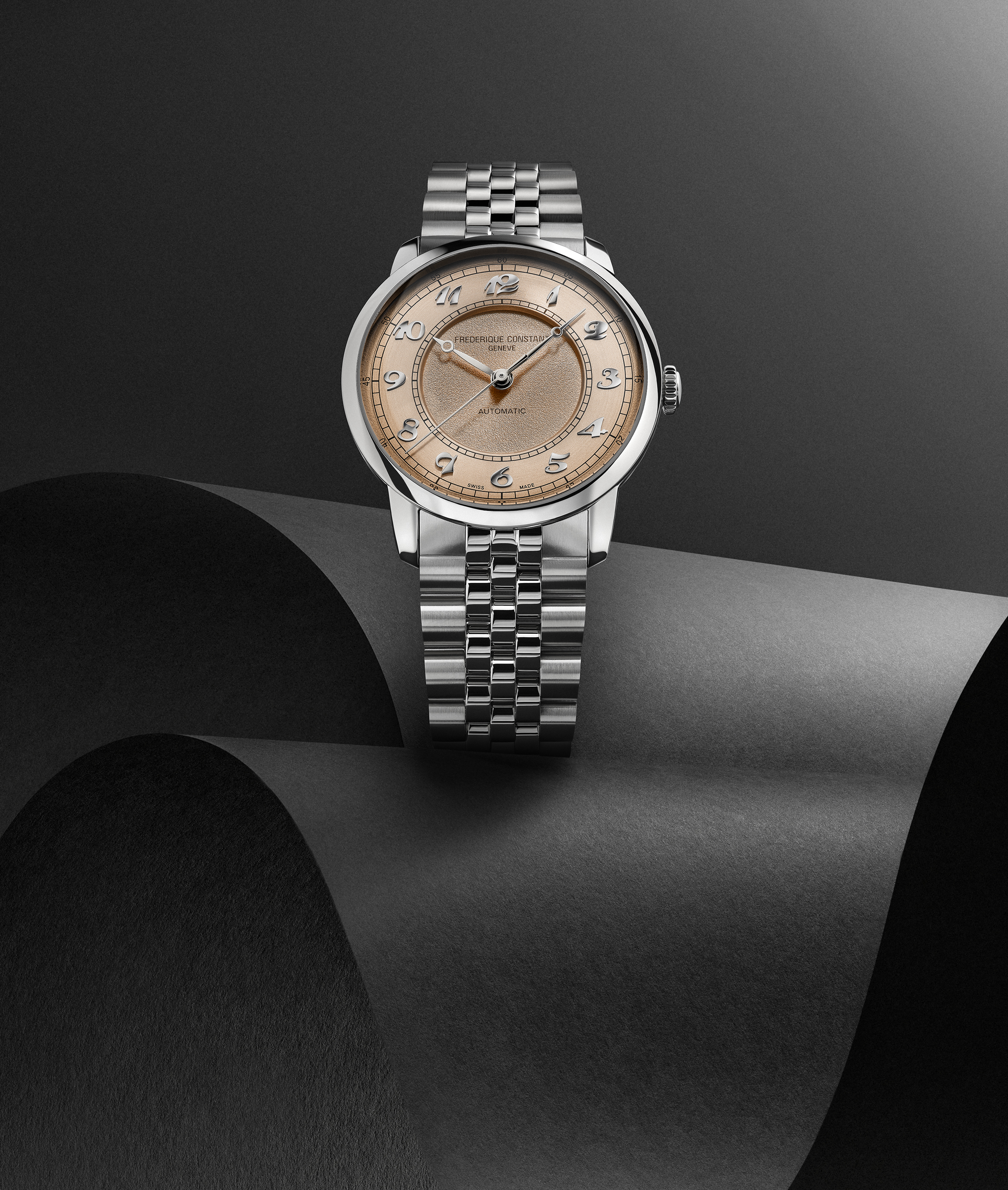 38.5 mm径サイズの自動巻きモデル「クラシック プレミア」。小ぶりなユニセックス仕様のサーモンピンクカラーのダイヤルに、半円形の5連ブレスレットを組み合わせました。中央から縁に向かい膨らむボンベダイヤルの中央は一段下げてグレイン、外周にはソレイユと凝った仕上げを施しました。クリスタルケースバックからは搭載したラ・ジュー・ペレ社のロングパワーリザーブムーブメントが覗きます。