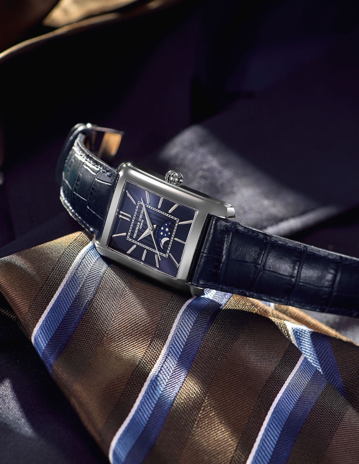 1920年代のアールデコを基調とした、タイムレスなエレガンスを凝縮した自動巻き時計コレクション「クラシック カレ オートマチック」。新作は、ムーンフェイズを搭載しました。レクタンギュラーケースに収められた文字盤にはソレイユ装飾、内側にはスクエアのミニッツトラックに囲まれたギョーシェ装飾のシェブロンモチーフをあしらいました。12時位置のブランドロゴと対をなすように、6時位置にはムーンフェイズを配置。クラシカルな意匠の中に、詩的なムードを添えました。