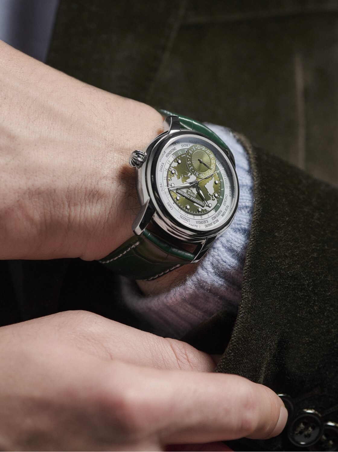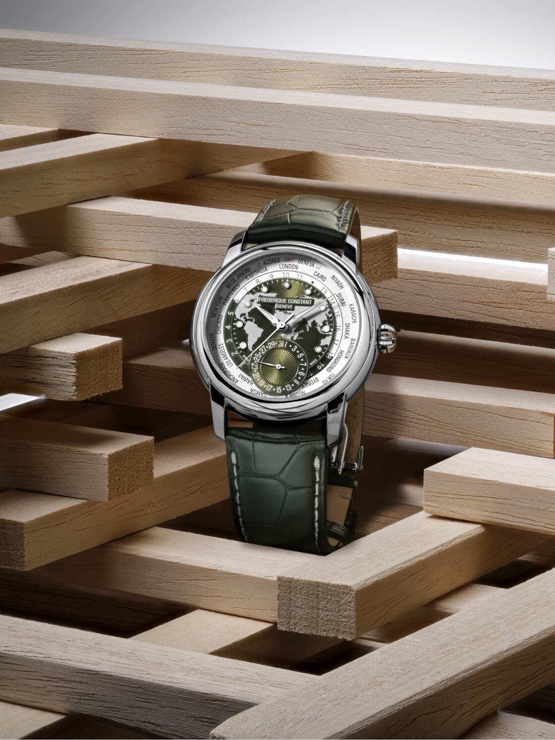 フレデリック・コンスタントのベストセラーモデル、自社開発キャリバー“FC-718”を搭載したワールドタイマー。ダークグリーンのレリーフの天球図に、6時位置のソレイユ装飾をあしらったデイト文字盤の日付針が日付を表示します。リューズ1つで巻き上げ、時刻、そして都市の設定などが調整できる操作性の高さが魅力です。