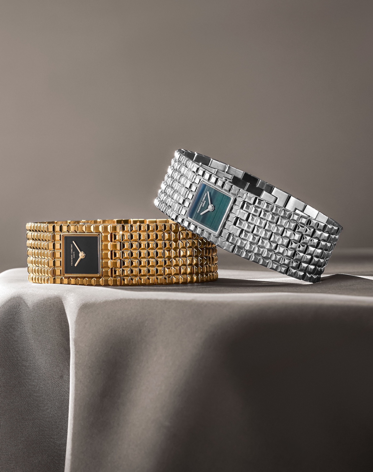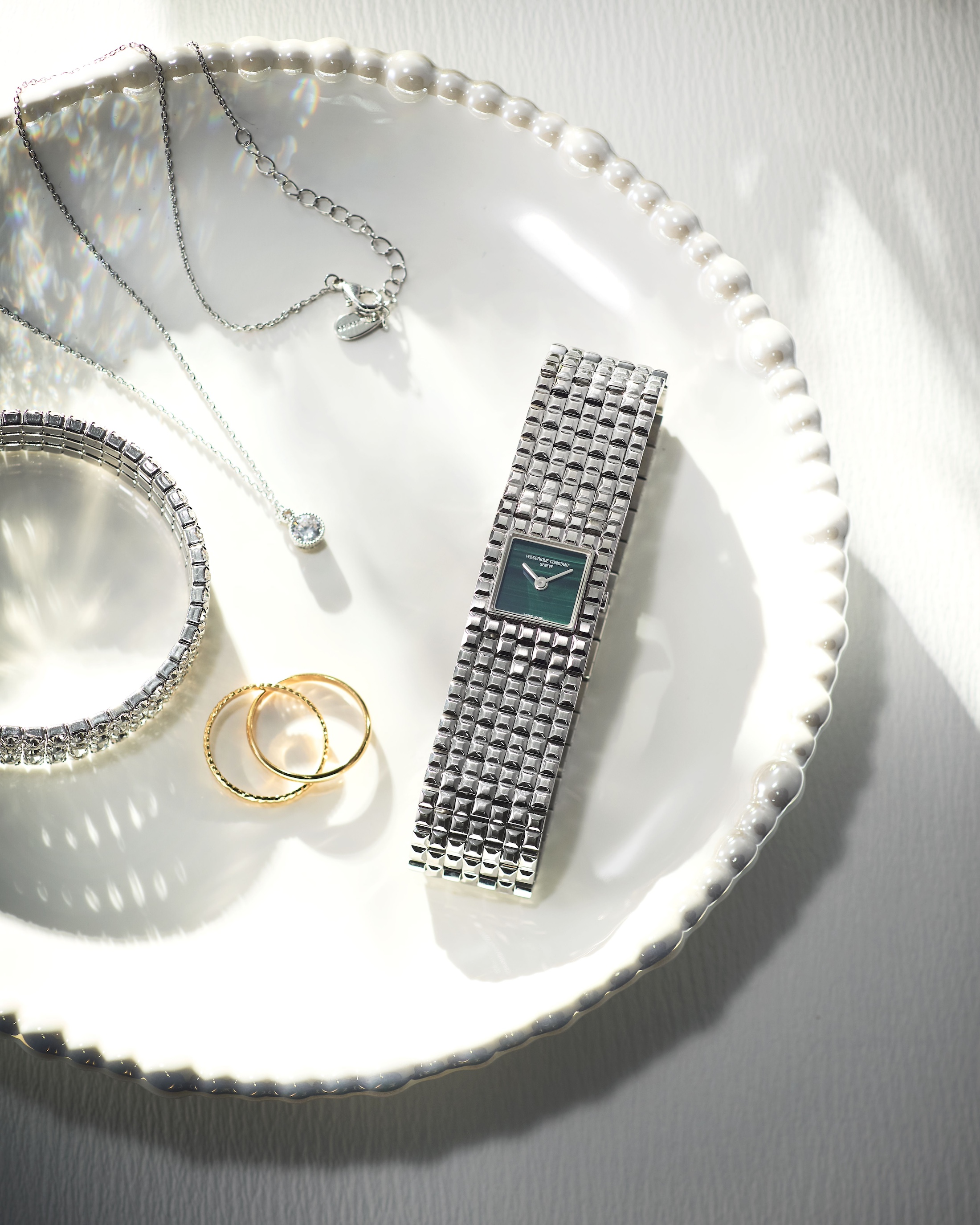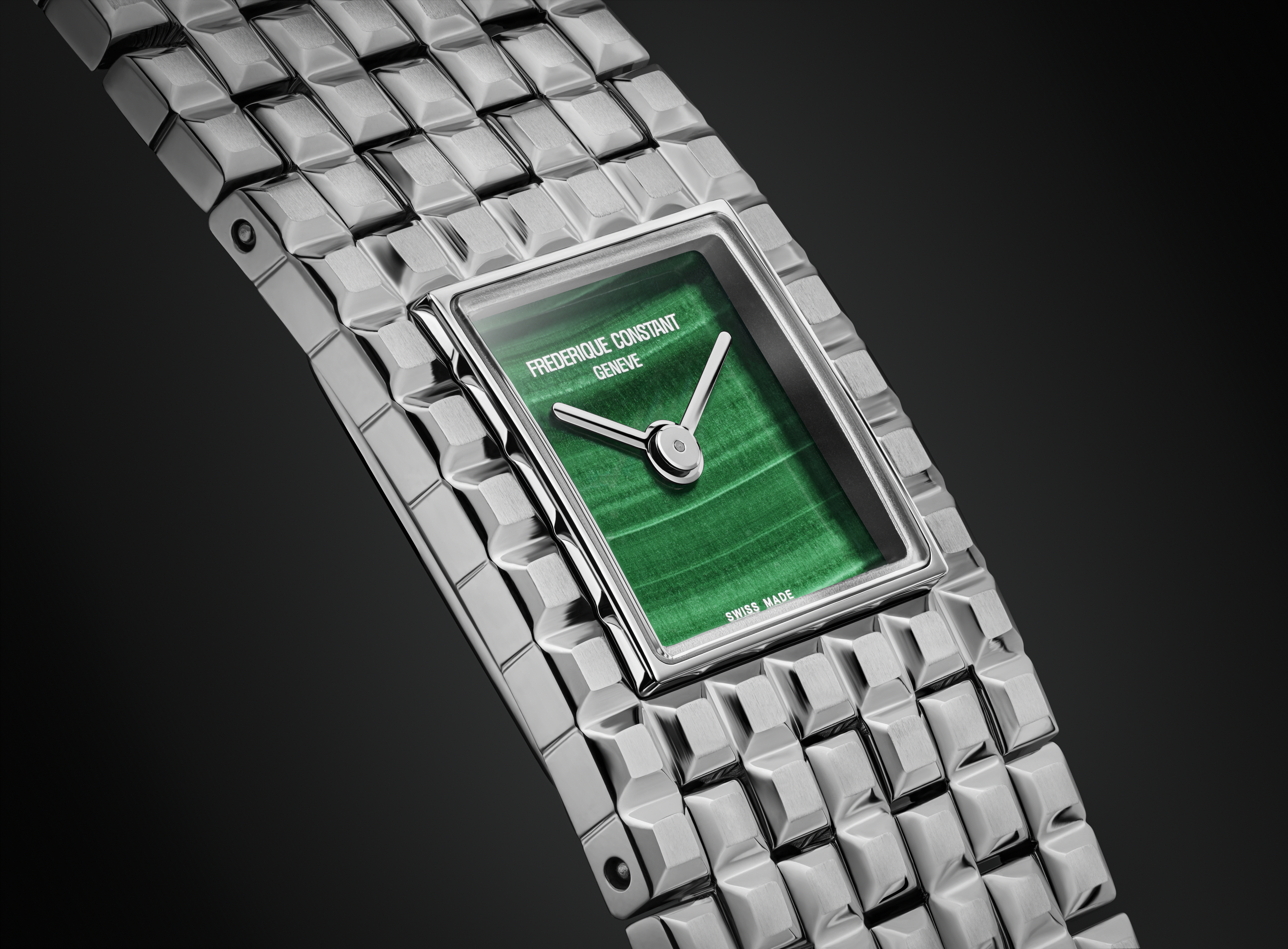 20年以上ぶりに復活を遂げた、カフウォッチのアイコン「マンシェット」。“時を読む”以上に“装うこと”を楽しむ、フレデリック・コンスタントが贈るジュエリーウォッチです。7リンク構成のブレスレットと一体化したスクエア文字盤が、手元をエレガントに引き立てます。天然石ならではの表情豊かなグリーンが印象的なマラカイトダイヤル。シンプルな時分針のみのデザインが、素材の美しさをより際立たせます。