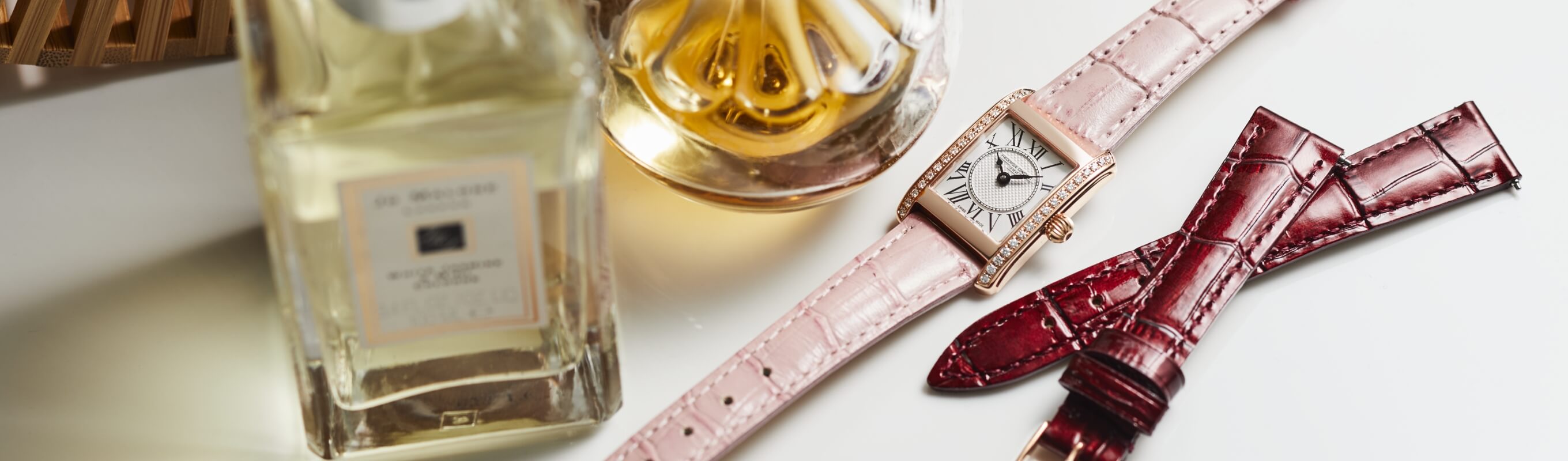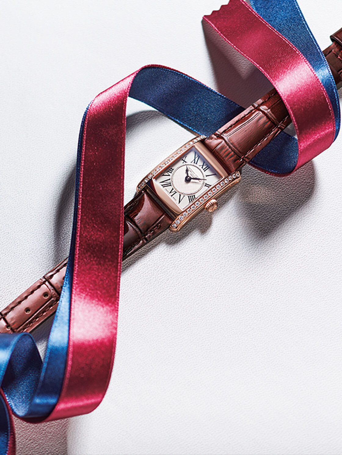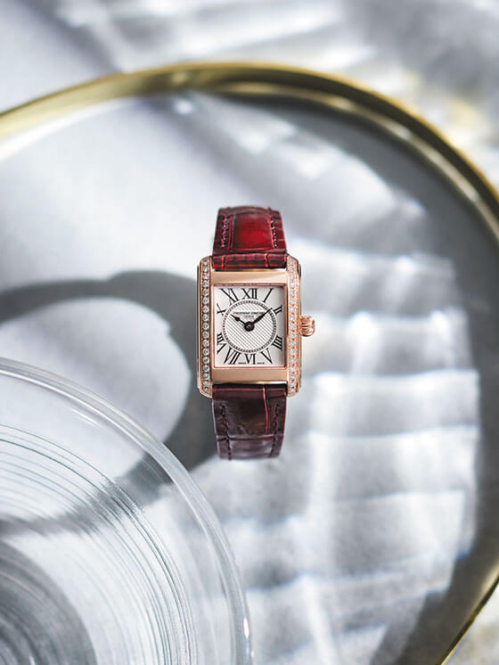 フランス語で「スクエア」を意味するカレ。1920年代後半に時代を博したエレガントでファッショナブルな女性からインスピレーションを受けたデザインは、ローマ数字のインデックスや、ギョーシェ装飾を施したダイヤルといった細部にまでこだわり、クラシックでありながら、スタイリッシュな時計です。ケースサイドには34石のダイヤモンドを豪華にあしらいました。