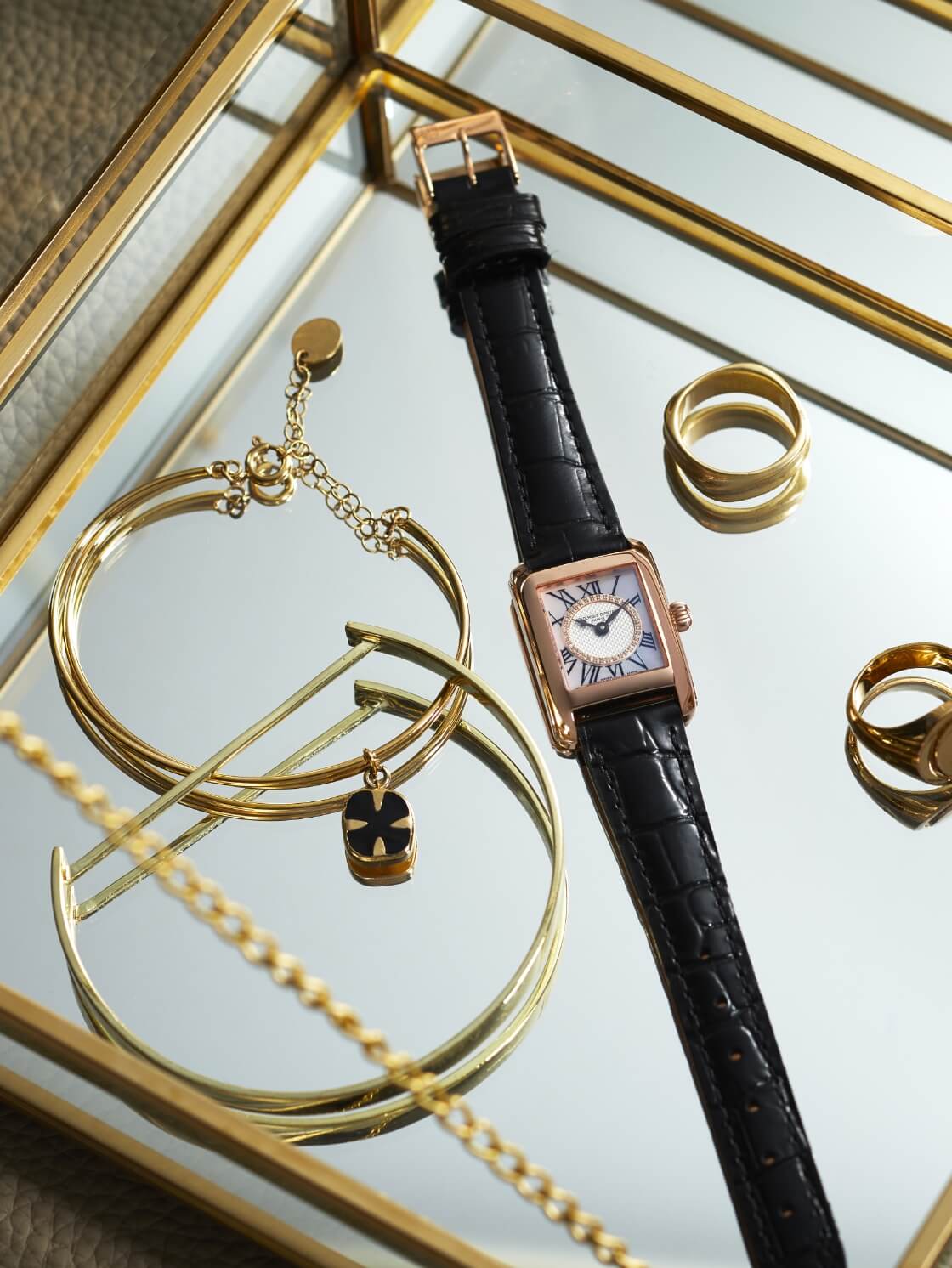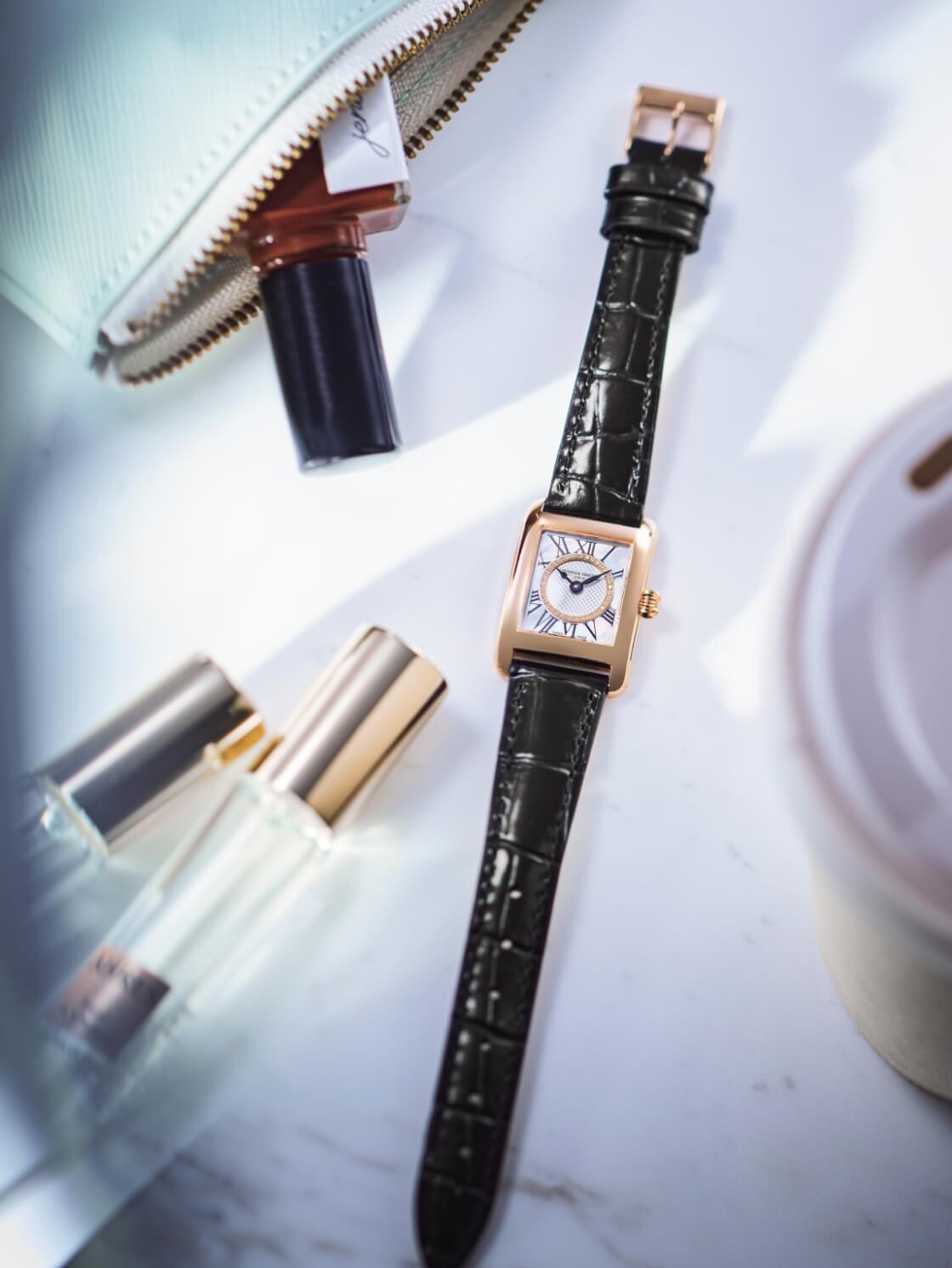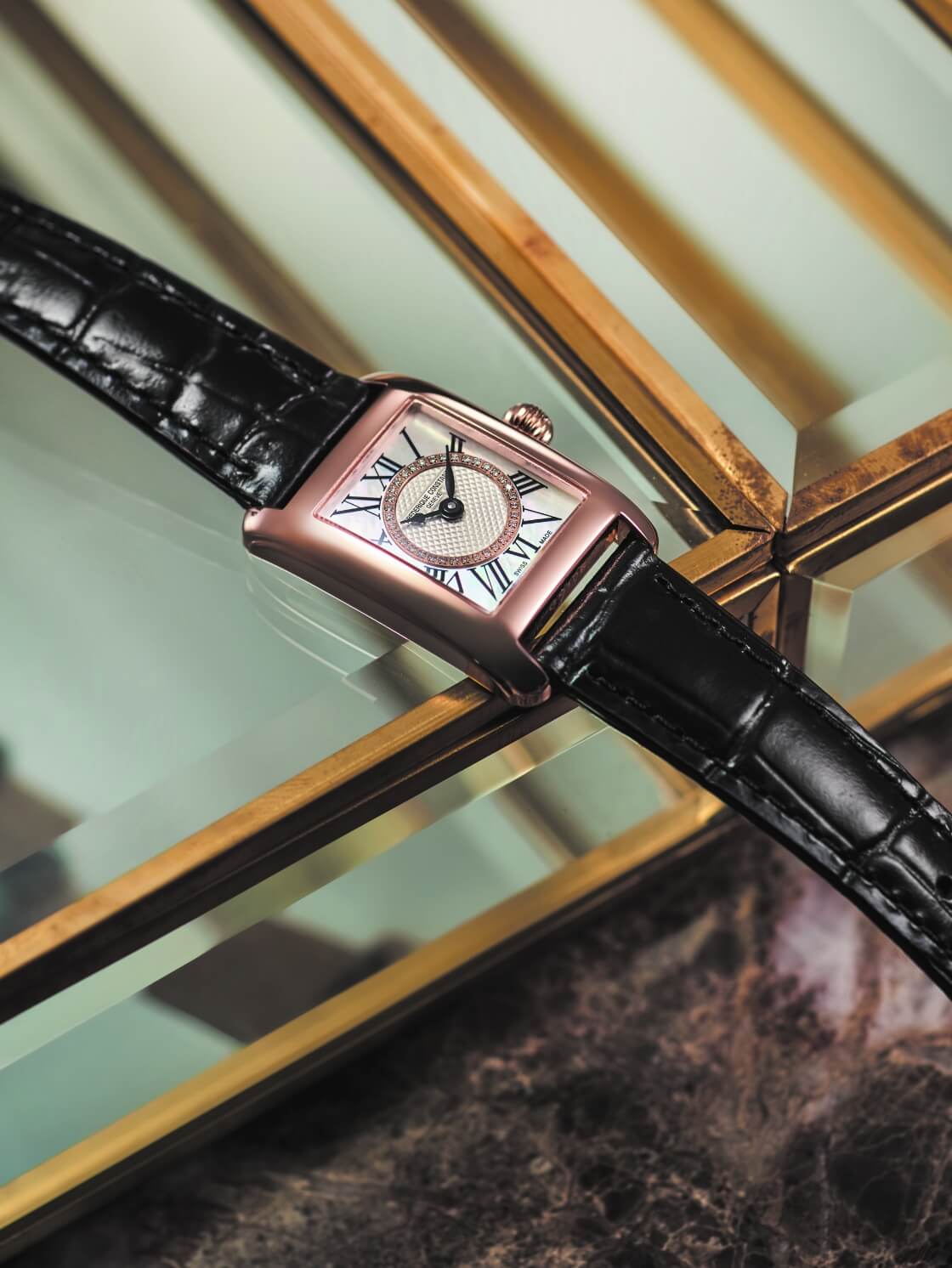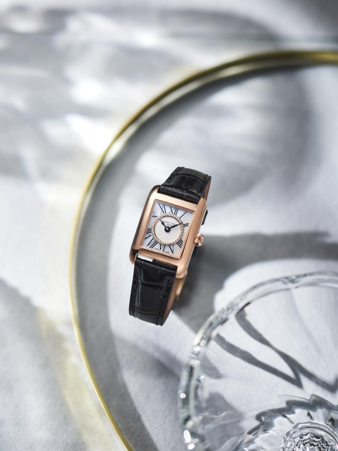 古典美とスタイリッシュさを兼ね備えた美しい”クラシック カレ レディース”の日本限定モデル。中央にはギョーシェ装飾、これを35石のダイヤモンドが囲み、さらにマザーオブパールを配し、優美な姿を表現しました。スペード時針やリーフ分針もクラシカルエレガントな表情で手元を美しく飾ります。