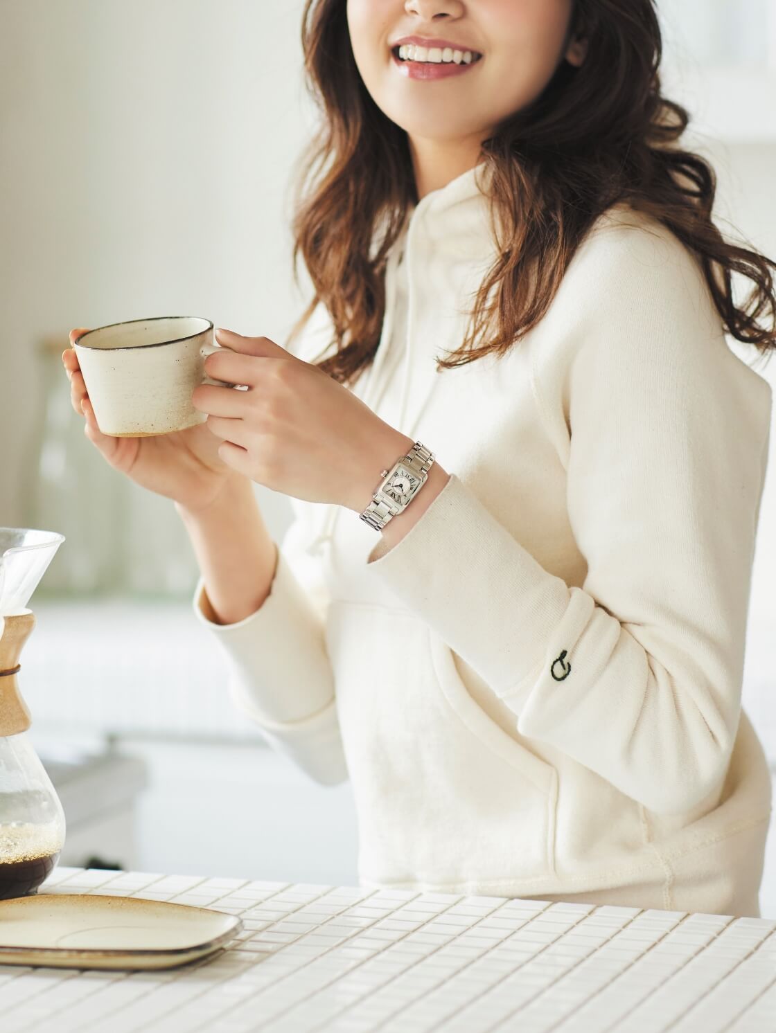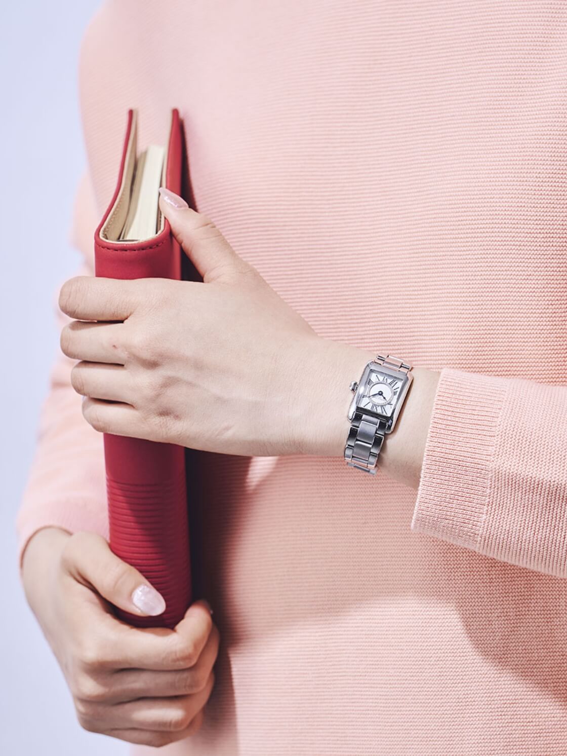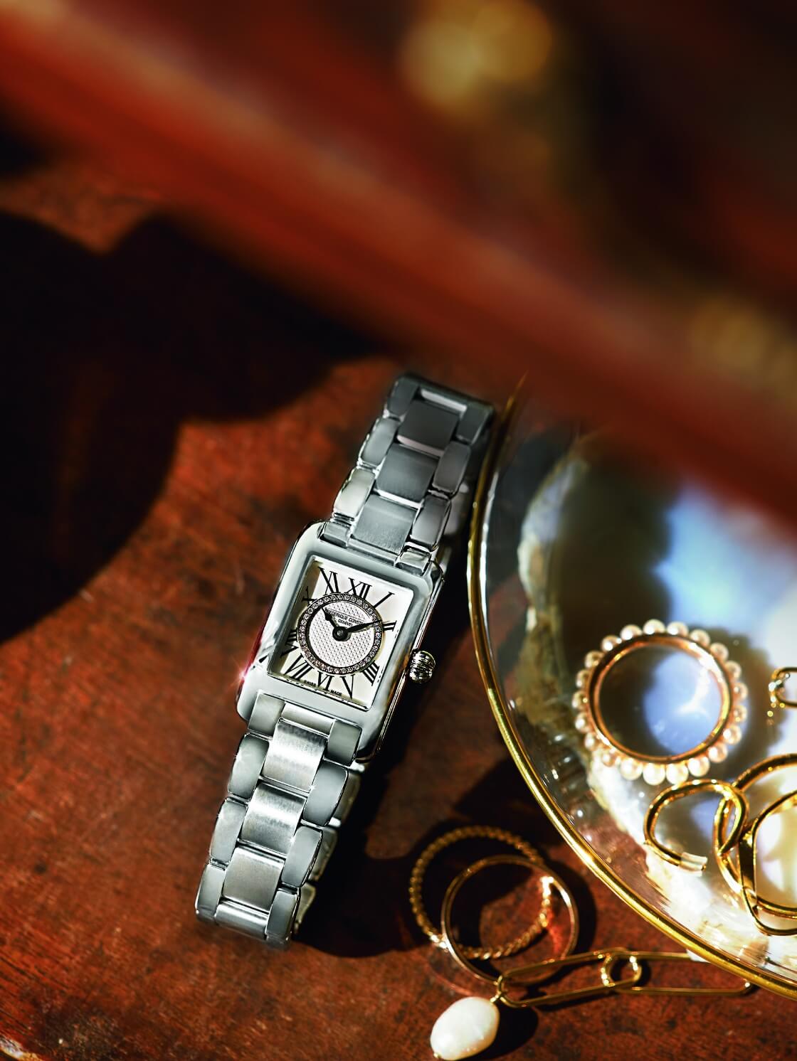 可憐にサークルダイヤをあしらうクラシック カレ レディースにステンレスのメタルブレスレットモデルが登場。クル・ド・パリのギョーシェ装飾を35石のダイヤモンドでサークルに囲み、周囲にマザーオブパールを配し、優美な姿を表現しました。スペード時針やリーフ分針もクラシカルエレガントな表情で手元を美しく飾ります。