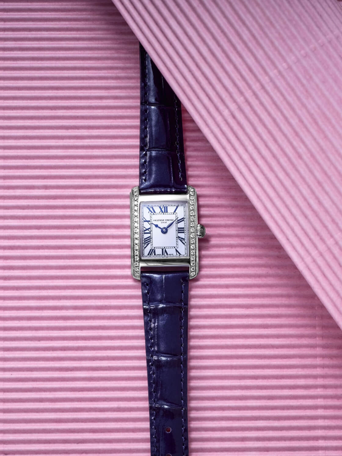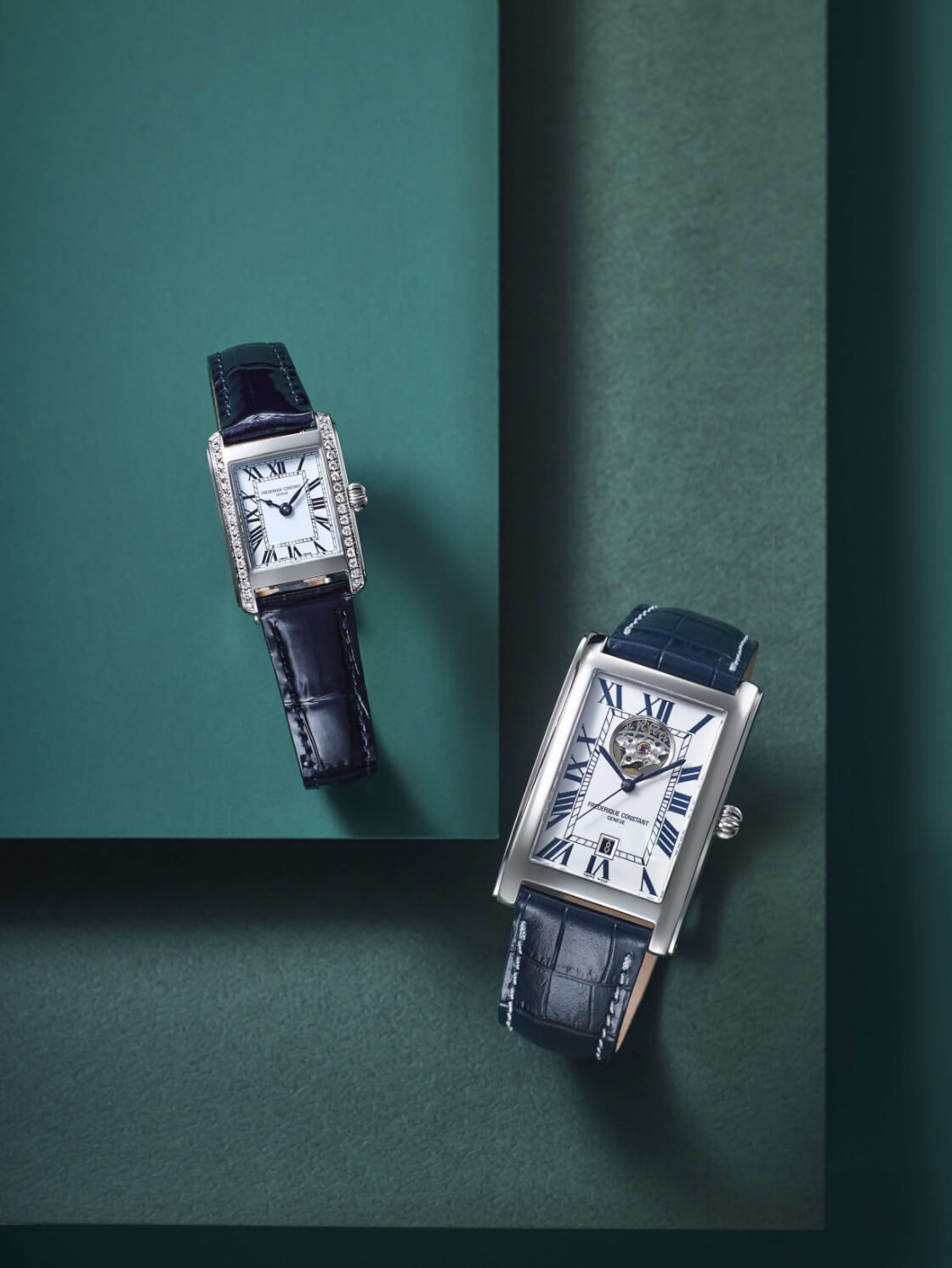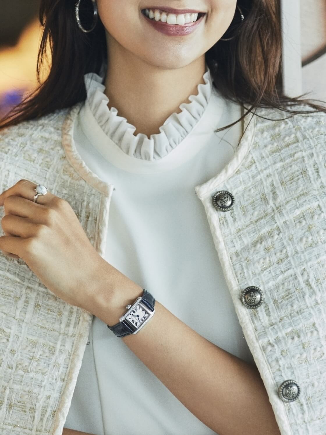 フランス語で「スクエア」を意味するカレ。1920年代後半に時代を博したエレガントでファッショナブルな女性からインスピレーションを受けたデザインです。スクエアケースに合わせてスクエアのミニッツトラックを配し、スペード時針とリーフ分針をあしらいました。リューズは古典的なオニオンシェイプ、インデックスはローマン数字といったクラシックなディテールこだわった上品な時計です。ケースサイドには34石のダイヤモンドを配し気品あふれる表情で手元を美しく飾ります。