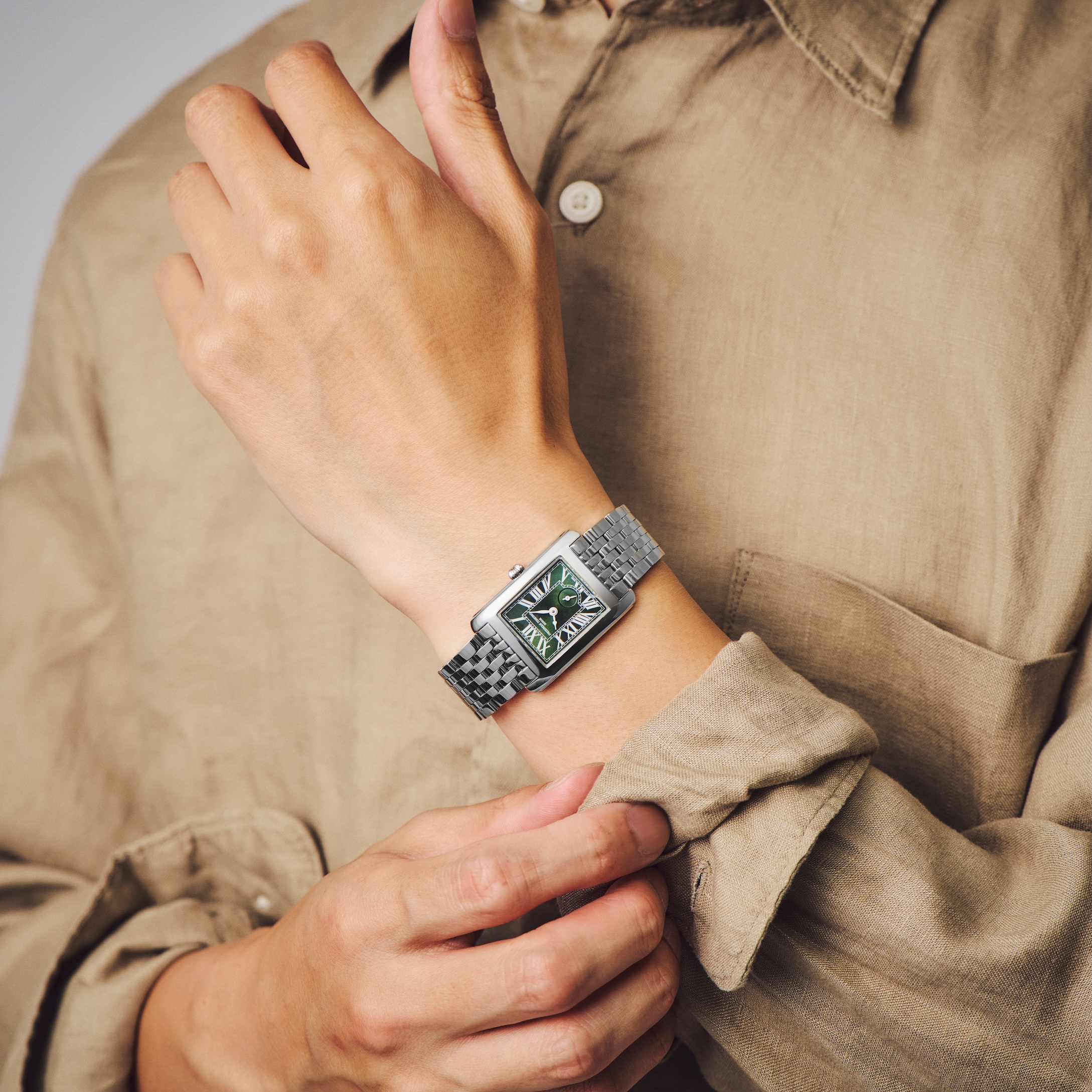 フランス語でスクエアを意味する“カレ”コレクションに、24年秋、仲間入りしたスモールセコンドを搭載した「クラシック カレ スモールセコンド」。サイズがトレンドの小径、ノンジェンダーのミドルサイズとなり、使い勝手のよさで人気です。25年夏、グリーンダイヤルが登場。7連のしなやかなブレスレットは腕になじみ快適な着け心地です。