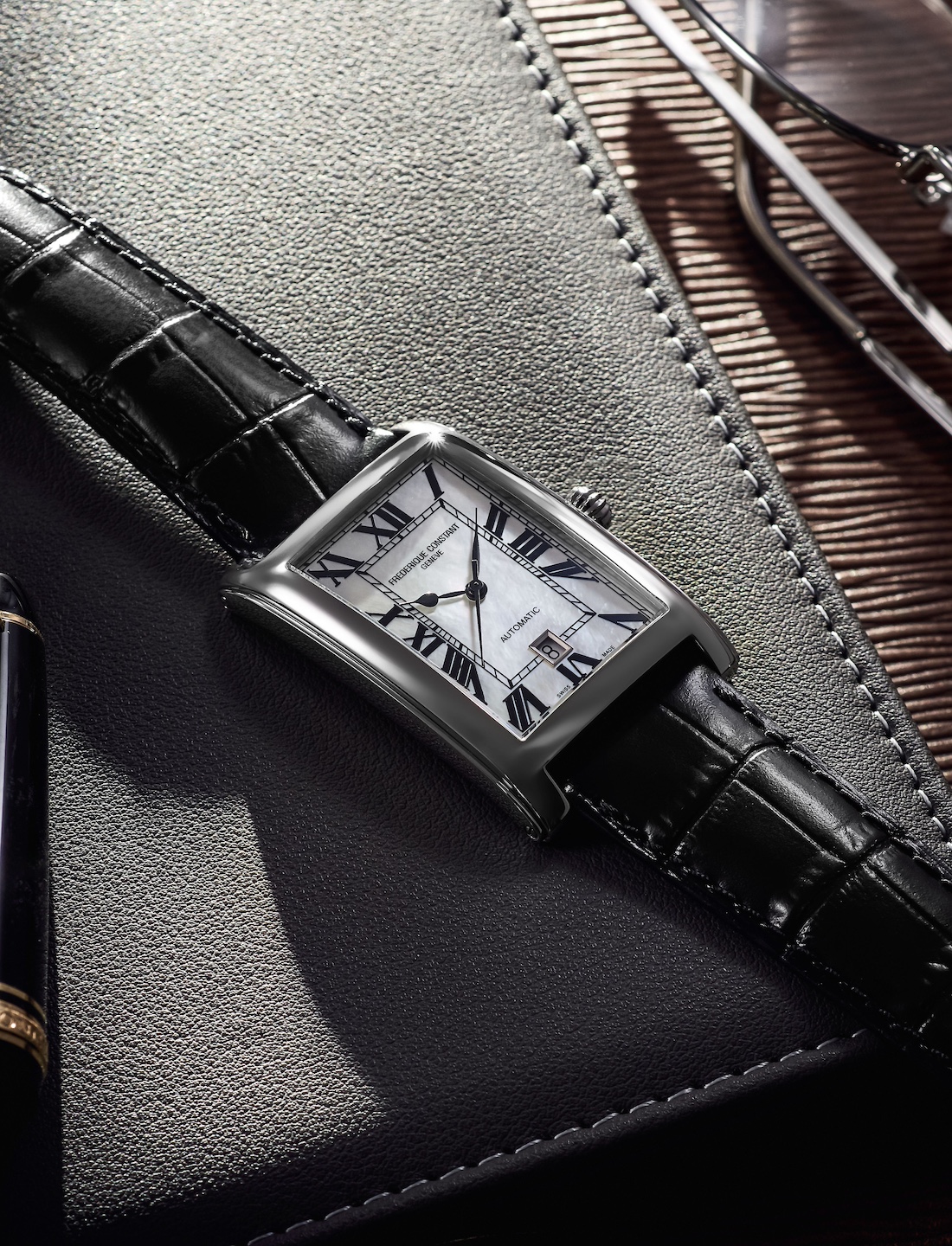 フレデリック・コンスタントのデザインDNAである<エレガント>をより体現する日本限定。文字盤には、上品な美しさ、そして天然素材のため同じ模様が存在しないマザーオブパールを全面に採用しました。アールデコの典型的なデザインで、ケース、レイルウェイ、デイト表示と、カレ“角”をベースにしたバランスがとても美しい時計。ペアウォッチとしてもご着用いただける時計です。