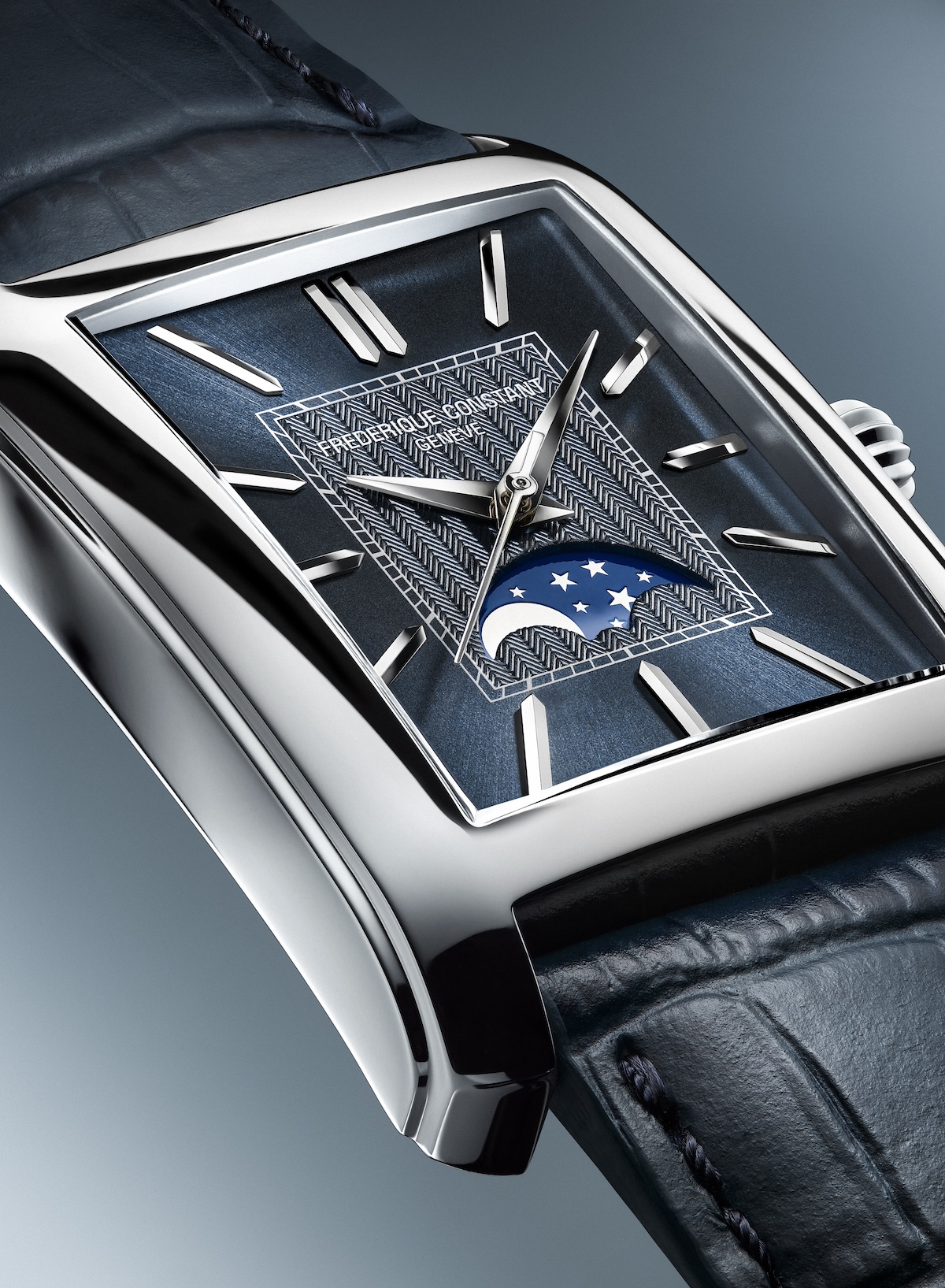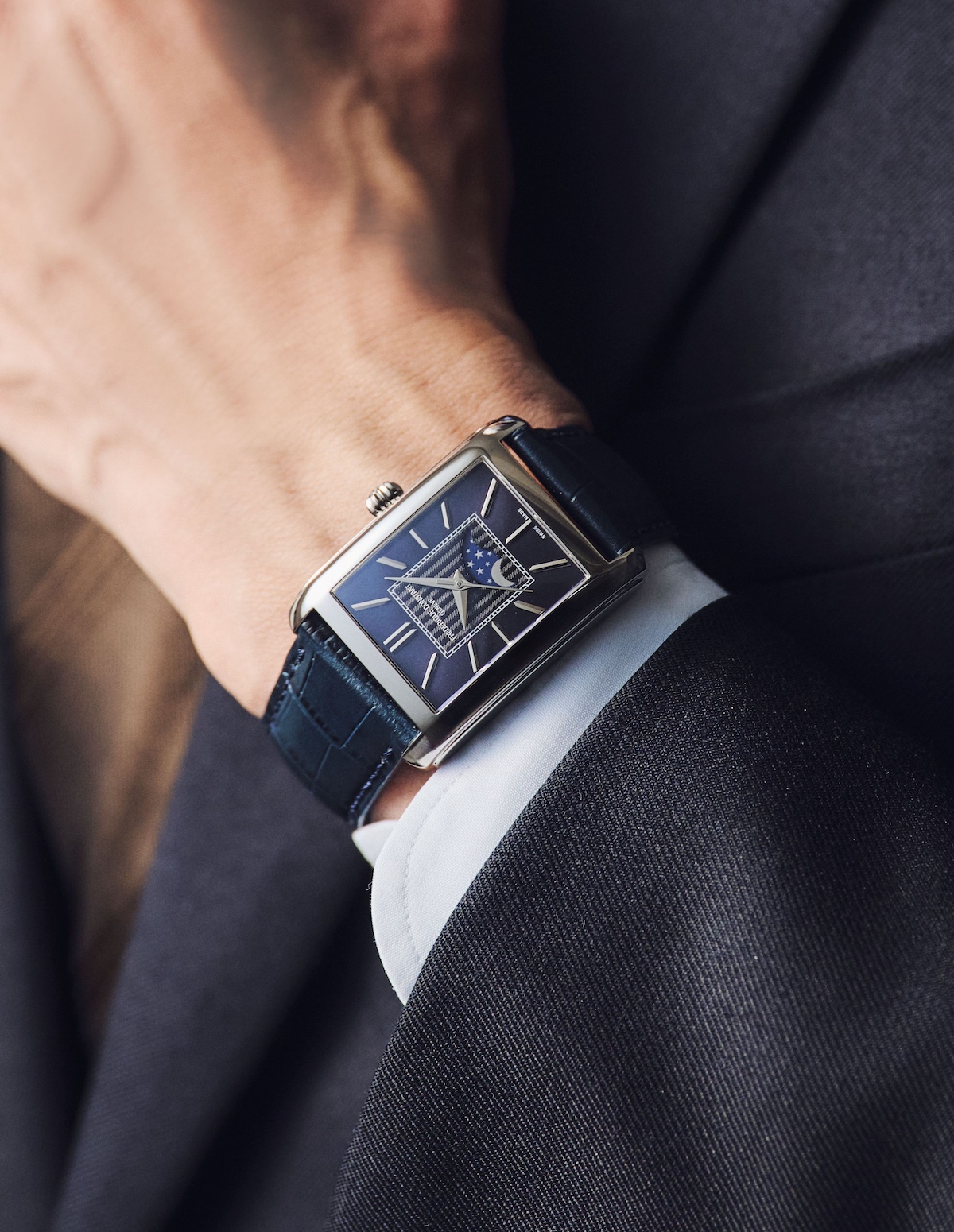 1920年代のアールデコを基調とした、タイムレスなエレガンスを凝縮した自動巻き時計コレクション「クラシック カレ オートマチック」。新作は、ムーンフェイズを搭載しました。レクタンギュラーケースに収められた文字盤にはソレイユ装飾、内側にはスクエアのミニッツトラックに囲まれたギョーシェ装飾のシェブロンモチーフをあしらいました。12時位置のブランドロゴと対をなすように、6時位置にはムーンフェイズを配置。クラシカルな意匠の中に、詩的なムードを添えました。