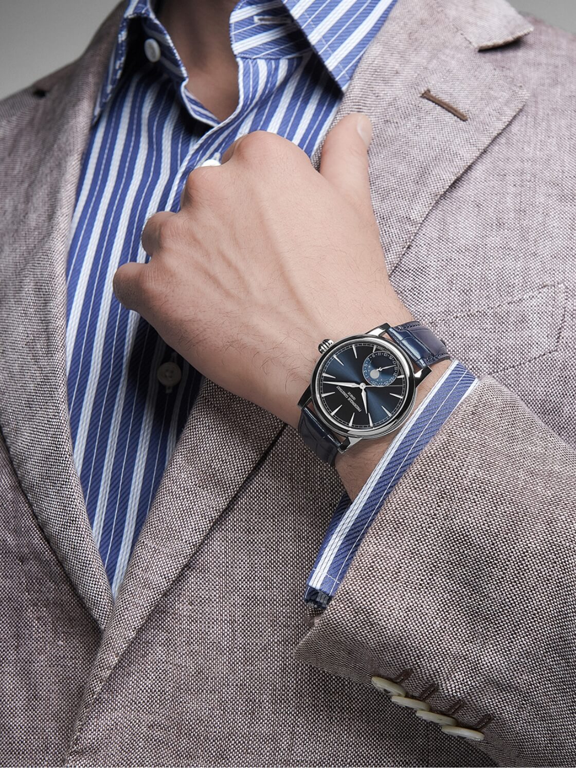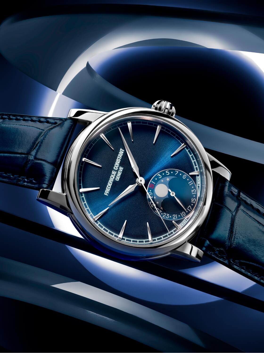 33番目の自社開発キャリバー“FC‐716”搭載。72時間のロングパワーリザーブが特徴です。光を反射し高い視認性のソレイユ装飾の文字盤に、手仕事でダイヤモンド研磨によるファセット加工が施された時針と分針、インデックスが配され、6時位置の窓には、ムーンフェイズとデイトの2つのコンプリケーションを統合させたカウンターを配置。この窓内に一日を刻む短い時間と長い月の満ち欠けの時間が共存し、やさしい詩情にあふれた天文学の世界が息づいています。このモデルには5年間の国際保証が付帯されています。