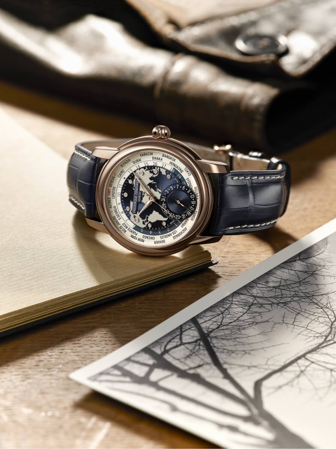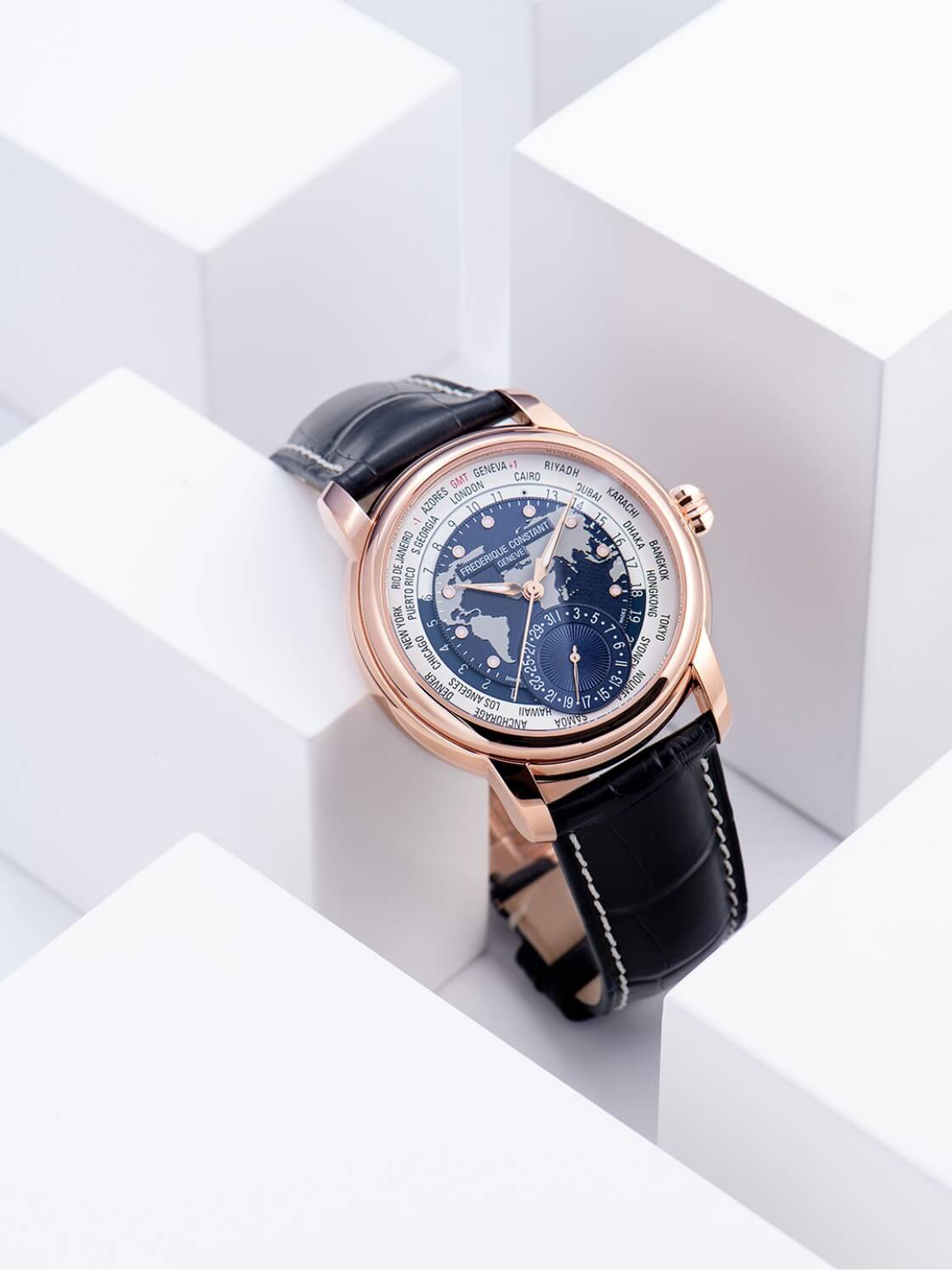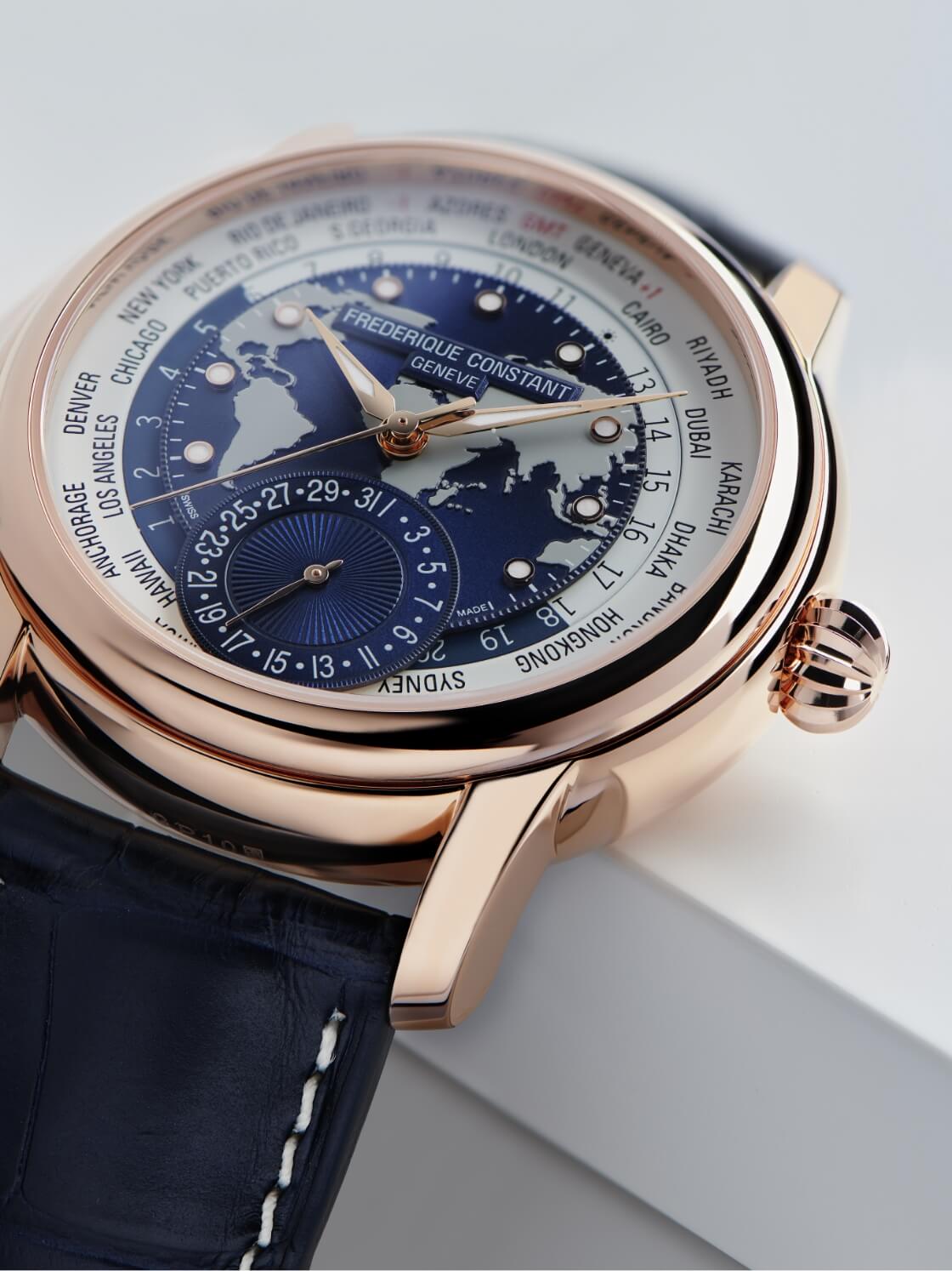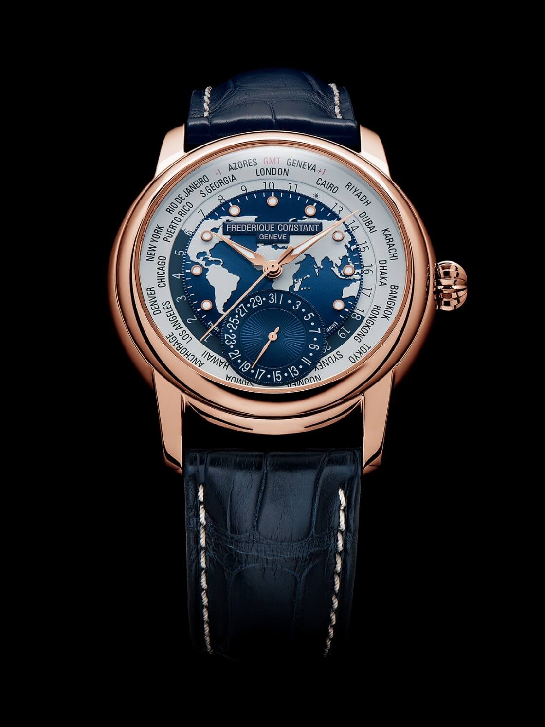 フレデリック・コンスタントのベストセラーモデル、自社開発キャリバー“FC-718”を搭載したワールドタイマーの誕生10周年を記念した、世界限定88本モデルが登場。文字盤には地球が描かれ、太洋は深いブルーカラー、大陸はグレーのレリーフで表現されています。ケースは18Kローズゴールド製。時針、分針、秒針、インデックスはケースと同色でコーディネート。ローズゴールドカラーがラグジュアリーな雰囲気を醸し出しています。リューズ1つで巻き上げ、時刻、そして都市の設定などが調整できる操作性の高さが魅力です。