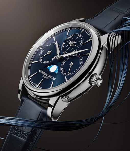 2016年に初の自社開発のパーペチュアルカレンダー<FC-775>を発表。2025年の新作は、このムーブメントに改良を加えた72時間のロングパワーリザーブを擁する34番目の自社キャリバー<FC-776>を搭載しました。ケースは40㎜とコンパクトにリサイズ、ネイビーカラーのソレイユ装飾ダイヤルを配しました。開発に高い技術を要する複雑機構のひとつと評される永久カレンダーを搭載しながらも、アクセシブルな価格を貫き、フレデリック・コンスタントが35年にわたって提唱し続けるコンセプト「手の届くラグジュアリー時計」を如実に体現しているマニュファクチュール時計です。